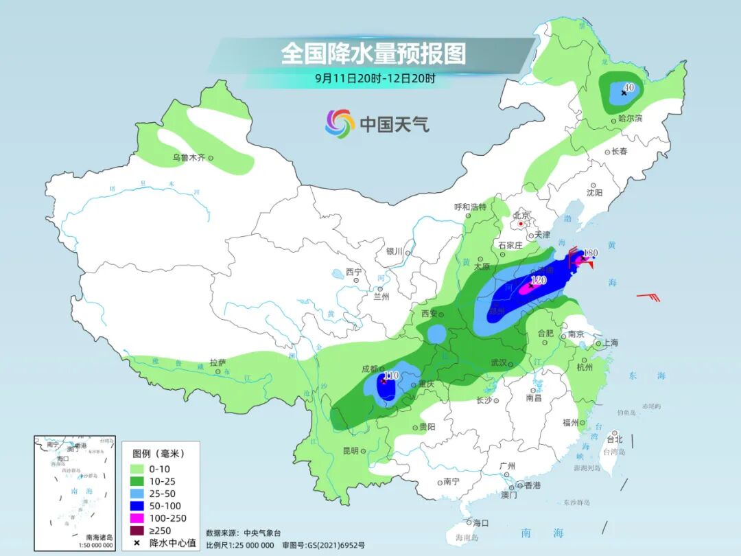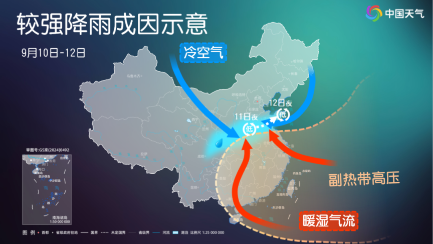 11日至12日,随着高空槽东移加深,并且伴随有低涡生成,副热带高压北侧的四川东部、陕西中南部、山西南部、湖北、河南、山东中南部一带有冷暖空气交汇,将自西向东经历一轮强降雨。