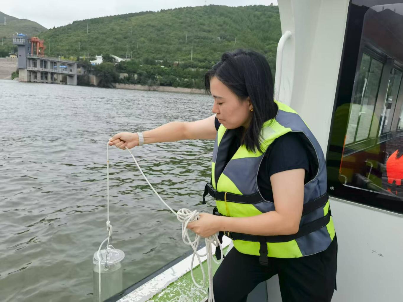 此时,北京市官厅水库水环境监测分中心化验员马晓萌穿上白大褂与救生衣,登上快艇,前往永1000断面。她熟练地启动多参数水质分析仪。屏幕上,溶解氧、pH值、浑浊度、电导率、水温五项指标数据实时跳动,无声诉说着这片水域的水质变迁。